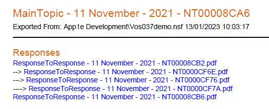 The Pipeliner Notes to PDF converter displays, on the top of the PDF file, the links to the Notes response documents that the main topic might have.