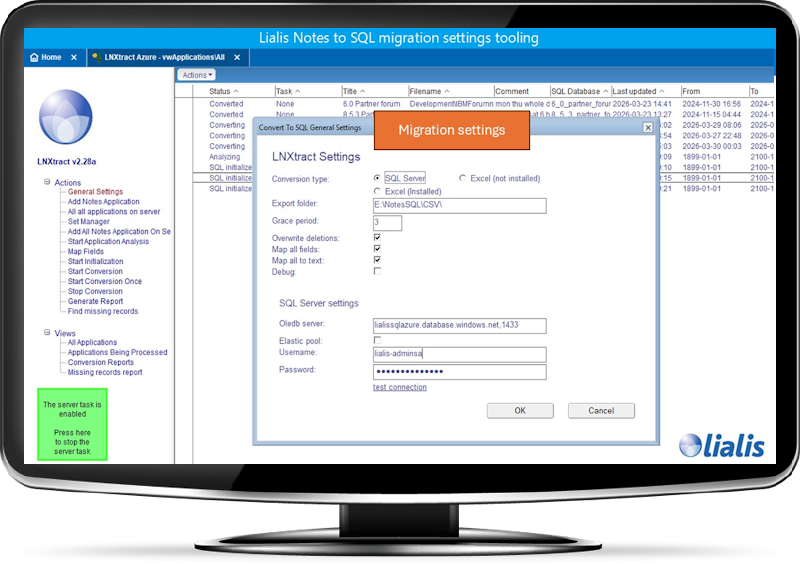 While large databases may take considerable time, Lialis Notes2SQL provides reliable and resumable migration runs to handle even very large datasets efficiently.