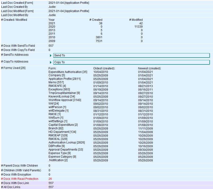 The Notes database Content Scan reports when the last Notes Document has been created and modified. It also shows the Notes Forms used sorted on date used range. In addition, it supplies details on the parent child structure (response docs). This info is handy in the actual Domino migration phase for example because some platforms don’t support this function.