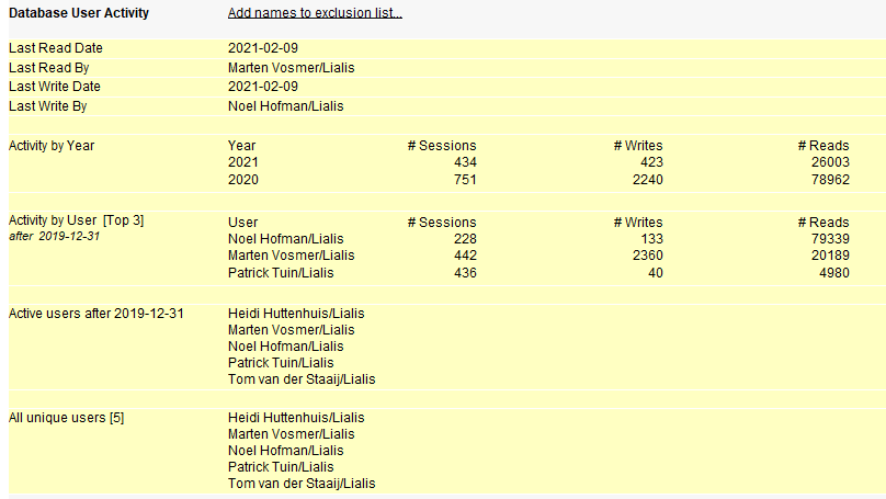 The Notes Database User Activity Scan result is displayed below. NDDM allows excluding of certain names like Domino servers and Domino administrators from the scan, so you only get real end users in your output. In addition it gives you the option to scan top x users from a specific date to determine the usage in the last year for example. A bandwidth of one year is in our experience a good starting point for your analysis.