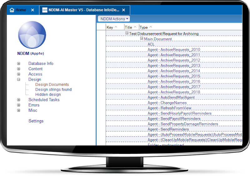 Design elements: forms, views, agents, subforms, script libraries, ACL, icons