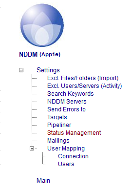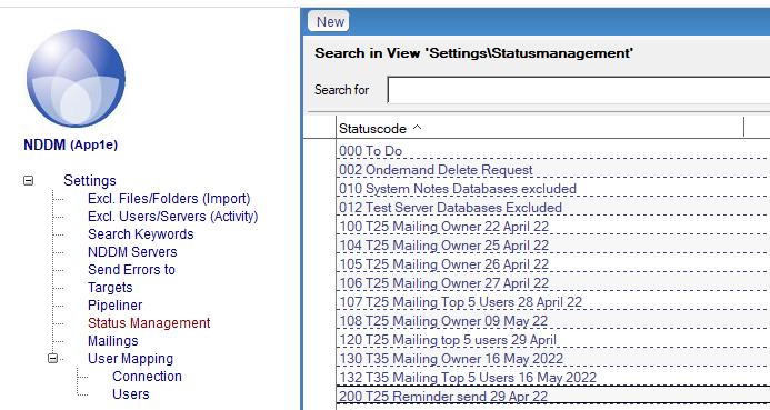 Here you can define the list of status values to be assigned on Notes databases to manage the life cycle. The status value can be used when carrying out communications with the NDDM questionnaire functionality, or during the archiving of the Notes database to SharePoint Online.