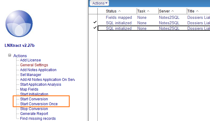 Click Start conversion (Once) to send the Notes content to the SQL database. The Domino server will execute this action.