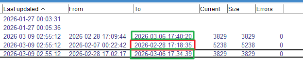 The image below shows three migration jobs for the same Notes database. You can see that the red job is lagging behind by approximately 8 days, while the green marked jobs are about 3 days behind. You can determine how many days a job is behind by looking at the last updated date.