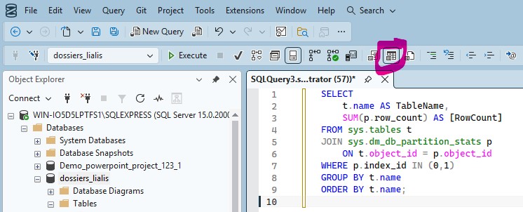 SELECT t.name AS TableName, SUM(p.row_count) AS [RowCount] FROM sys.tables t JOIN sys.dm_db_partition_stats p ON t.object_id = p.object_id WHERE p.index_id IN (0,1) GROUP BY t.name ORDER BY t.name; |