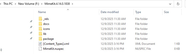 Rename the MimeKit.4.14.0.1838.nupkg file to *.zip so you can unzip the package and store the folder on the migration server, for example:
