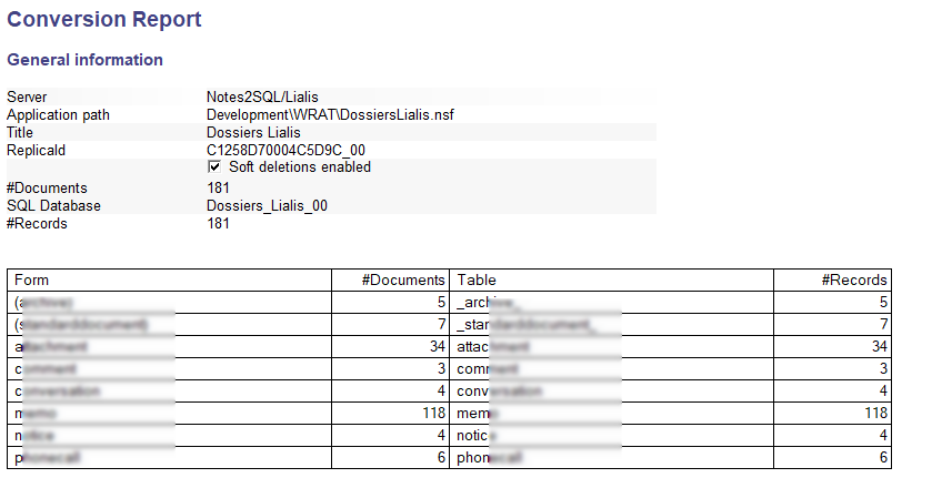 When the migration to SQL is complete (only for option Conversion Once), the software automatically generates a migration report comparing the number of Notes documents per form with the corresponding SQL tables to identify mismatches.