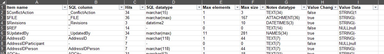 Before any Notes document is migrated, the tool first scans all fields in all documents in the entire Notes database. Notes is schema-less: every document can have different fields, different datatypes, different multi-value structures, and even rich-text or attachments. To migrate this safely into SQL, the tool needs to figure out exactly which SQL tables and columns are required. So the tool runs a full field analysis and produces a mapping table like the one above. Every row describes one Notes item (field) and how it should look in SQL. A few examples of this scan are listed below: