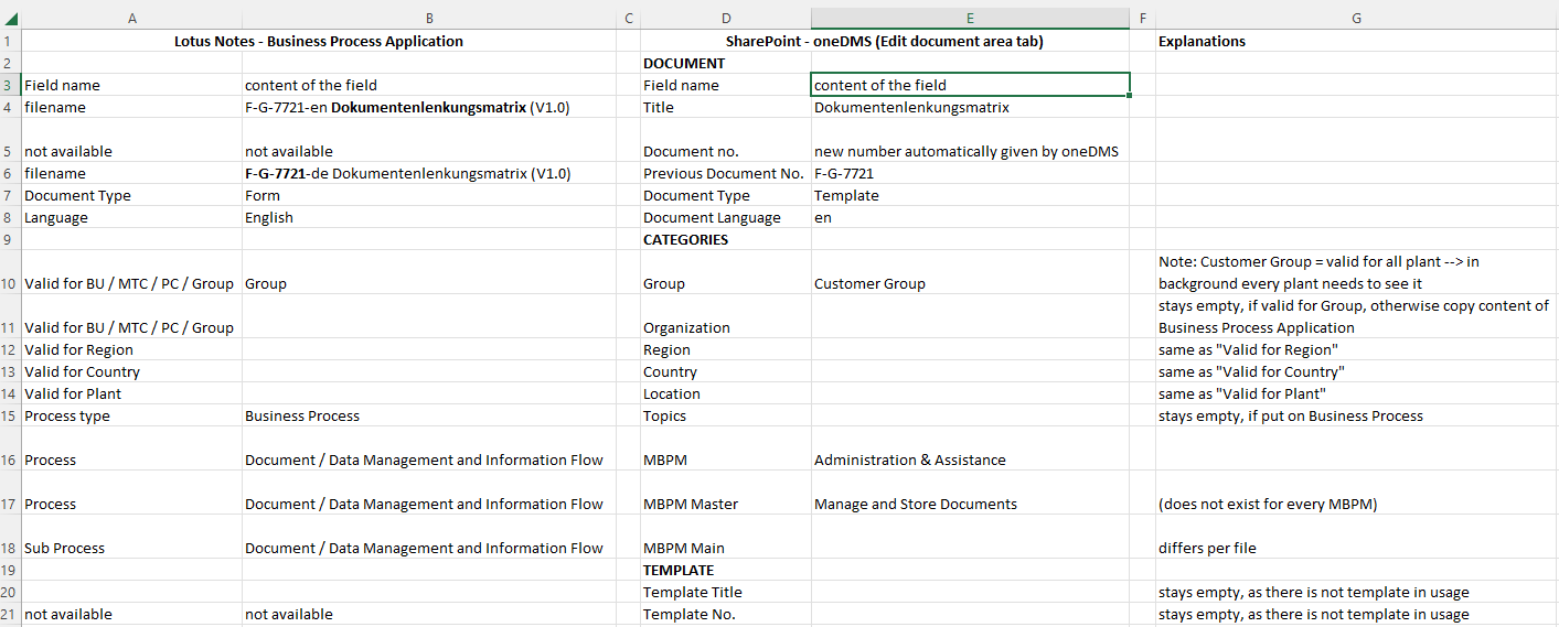 In the Lotus to SharePoint migration preparation, you need to make decisions, for example on what fields you want to migrate. Once this is clear our customer prepares an Excel table containing the mappings between the Notes fields and the available SharePoint columns. Also you may add comments to each mapping. For instance, if there are new SharePoint columns that do not exist in the Notes database. Also, if there are columns that should have a default value or a value different from the mapped Notes field, etc.